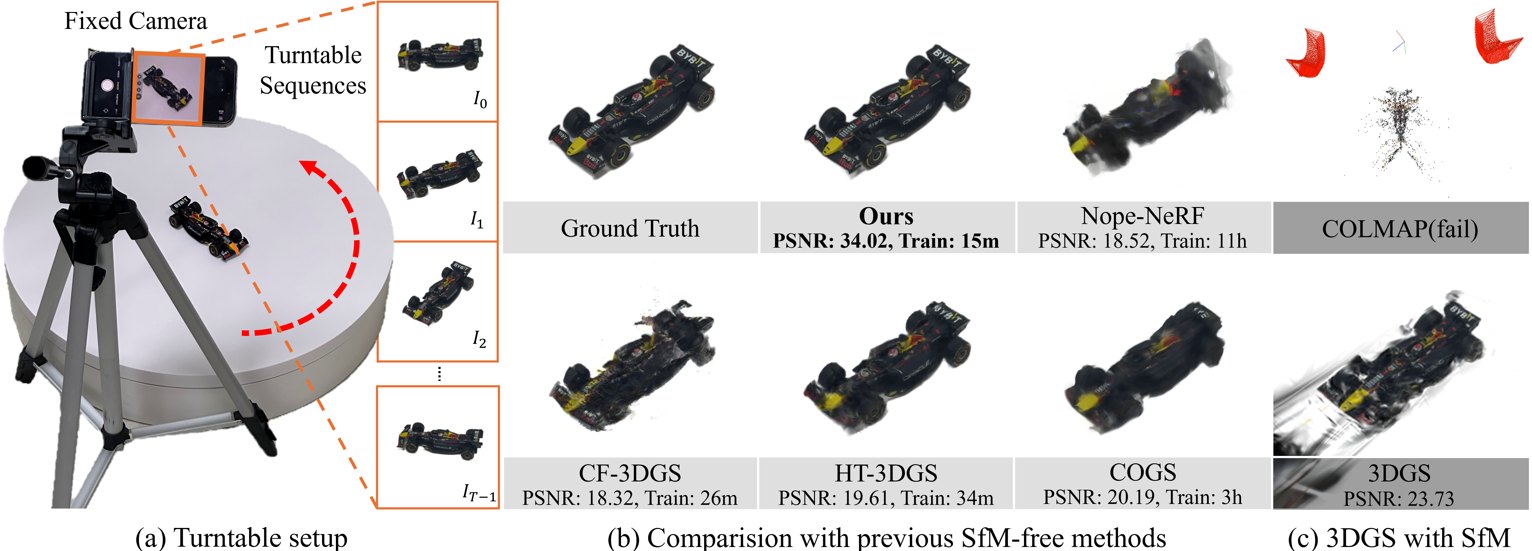 본 연구는 기존 3D 복원 과정에서 필수적으로 사용되던 Structure-from-Motion(SfM) 과정 없이도, 턴테이블 환경에서 물체의 회전 정보를 직접 추정해 고품질 3D 복원을 수행하는 새로운 3D Gaussian Splatting 방법을 제안한 것이 특징이다.